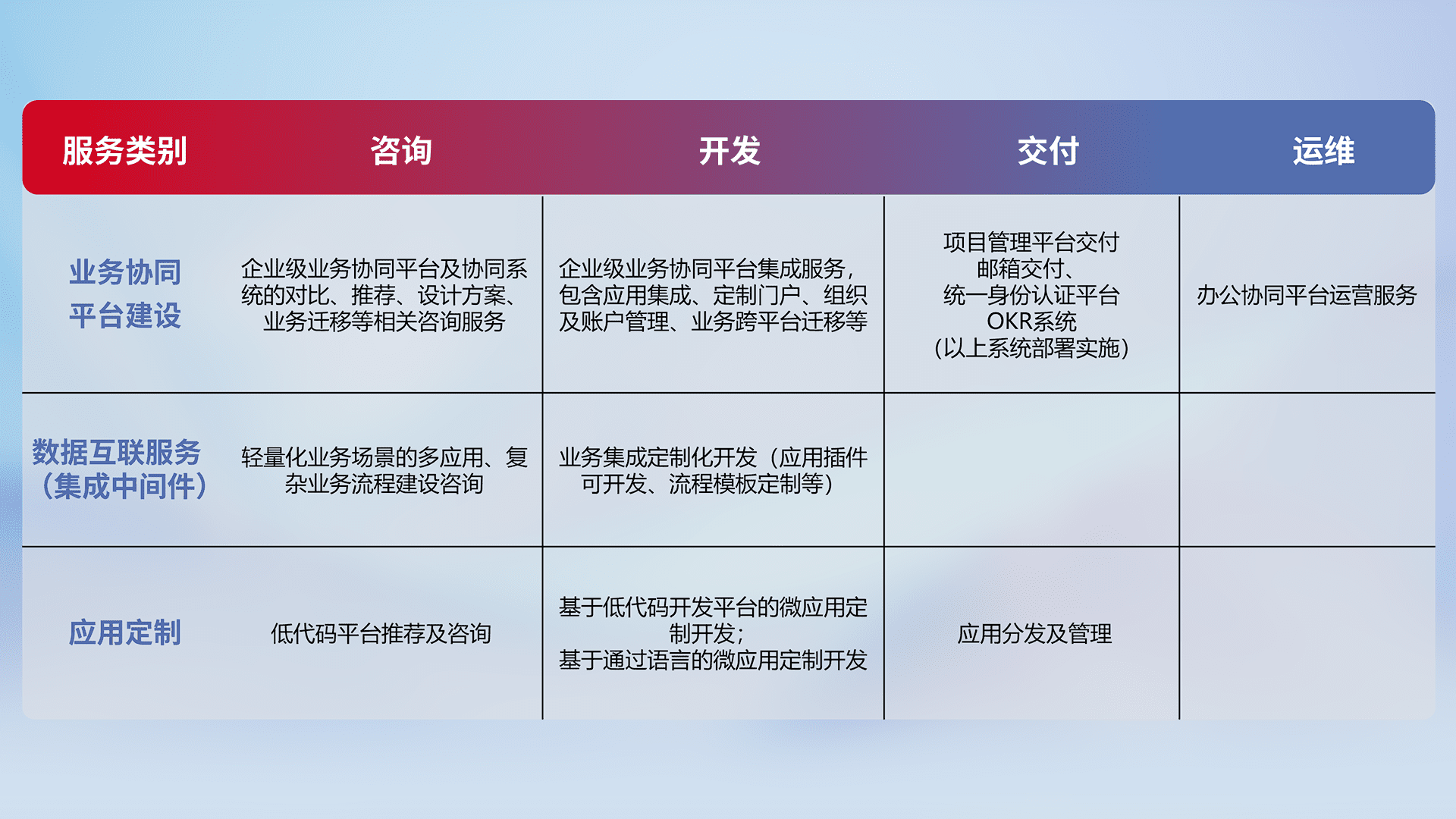 针对钉钉、、、企微、、、IDaas等平台级产品提供产品的规划、、方案、、、交付、、定制化开发等服务,,,实现如统一协同办公、、、智能客户服务、、、混合会议管理、、智能数据查询、、、、等业务场景,,,实现数字化转型。。