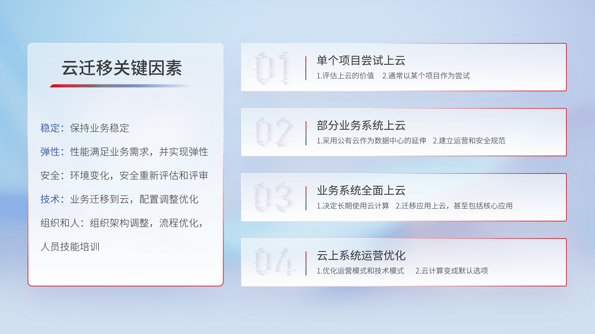 结合实际业务,,从规划设计、、、云平台选型、、、云原生改造、、数据迁移、、、、集成交付,,,迁移全过程为客户识别最佳上云路径,,,,做好风险识别管理,,,,设计网络架构、、身份权限、、安全审计合规、、、、操作审计、、、日志审计、、监控告警策略、、、、多站点容灾设计等,,,,对云上基础设施进行整体规划,,提升IT治理水平,,以满足弹性、、、高可用、、、高性能的需求。。。。