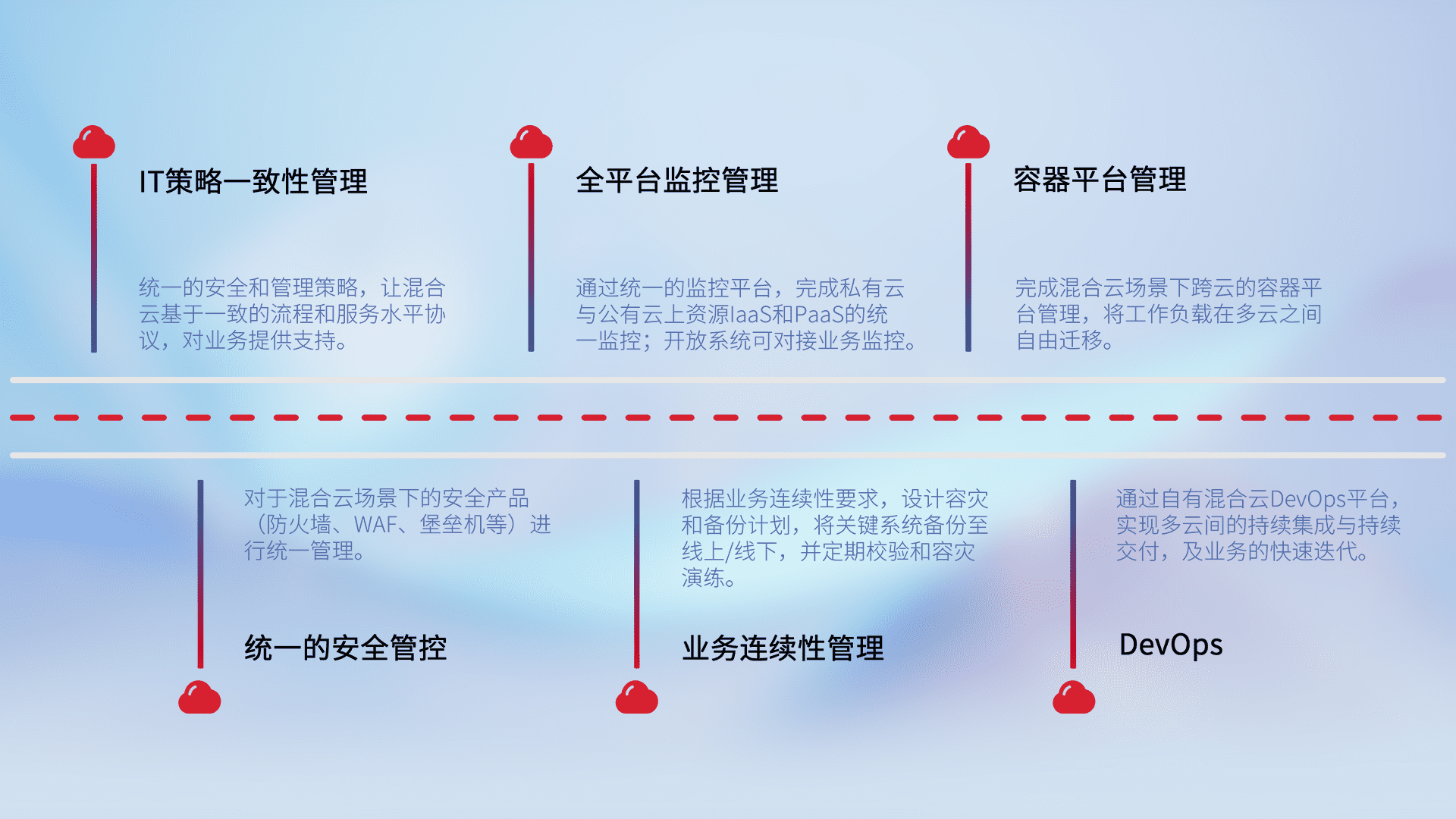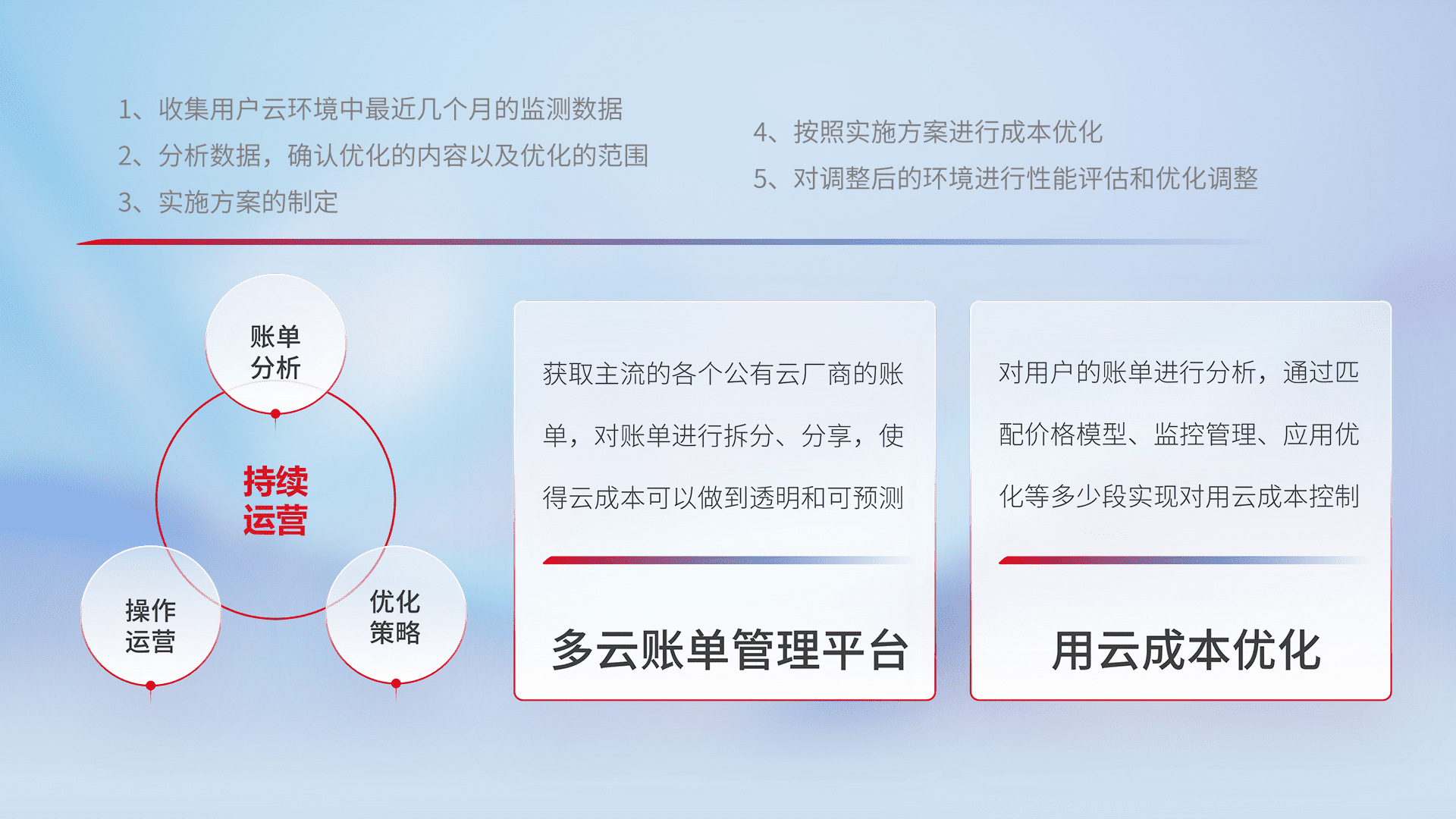 通过多云纳管,,,以统一的资源数据模型把客户的云资源进行抽象和封装,,,,进而实现对多云资源的统一操作,,,,保障云资源管理的可靠性、、、、稳定性与可用性。。量身定制化运维内容,,,,配置、、、、开发运维、、、补丁管理、、、备份、、监控、、、、认证和访问管理、、、、审计和日常巡检等,,,,保障在用云过程中的可靠度,,稳定度以及高可用率。。。